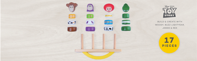 Spark imaginations and hours of creative play with the Toy Story Balance Blocks from Disney Wooden Toys. Featuring some of kids’ favorite Disney characters from Toy Story, this set include 16 building blocks plus balancing base to create each character in their classic look including Woody, Buzz Lightyear, Jessie, and Rex. Kids will love stacking the blocks and using the pedestal to balance all of Andy’s adorable toy friends! These wooden blocks encourage little ones to use their imagination during free play and helps develop fine motor skills. Build out a world of fun when you introduce this classic play experience into your child’s playtime, including wooden figures, blocks, balancing blocks, cars, trains, puzzles, and clutch toys. Collect both Disney Wooden Toys Balancing Blocks including Winnie the Pooh and Toy Story. Ages 18+ months