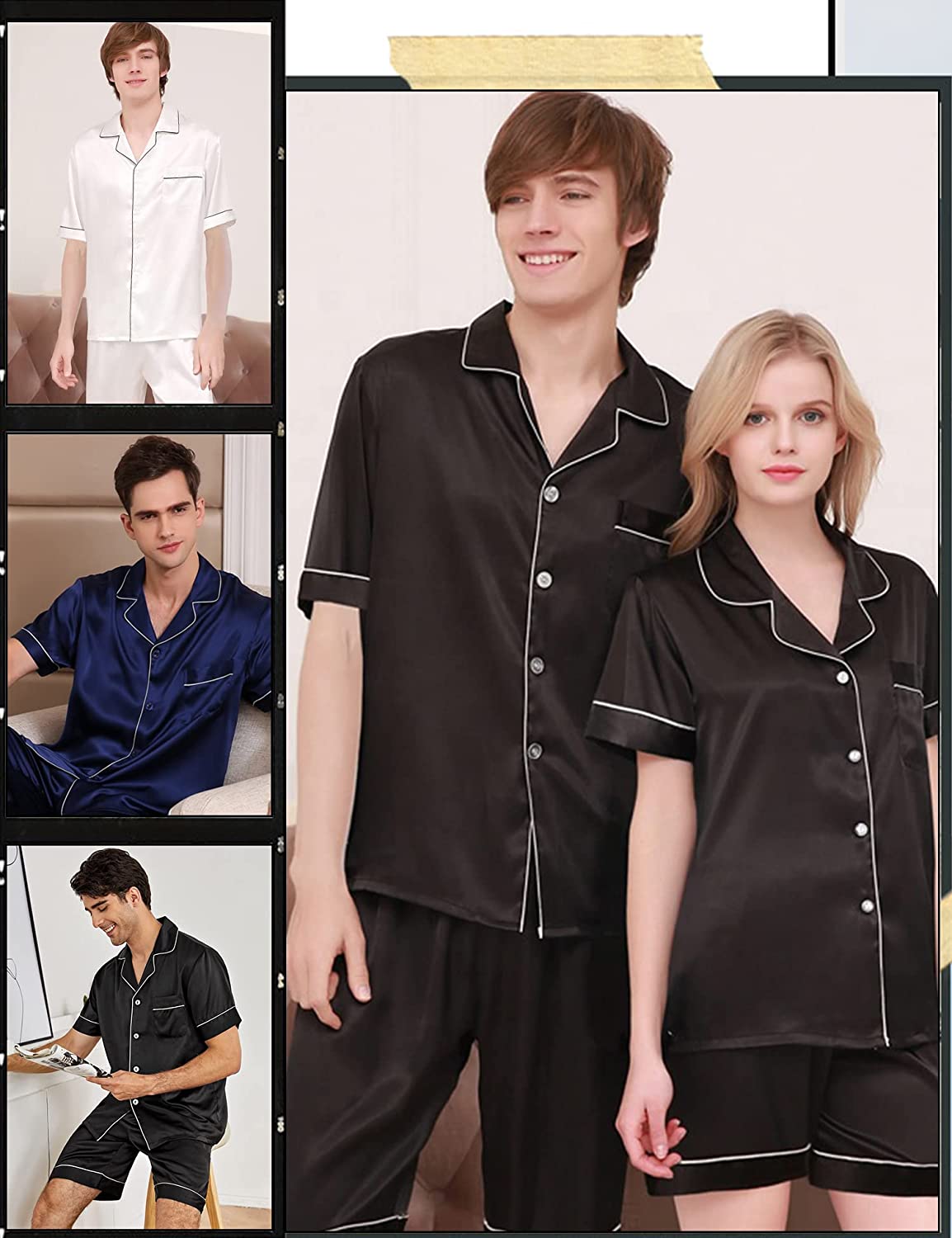 - COUPLES SATIN PAJAMA SETS - Short sleeve pjs is made of satin with some stretch touch, silky-smooth, very softly and comfy. Lightweight and skin-friendly material care for people's health.