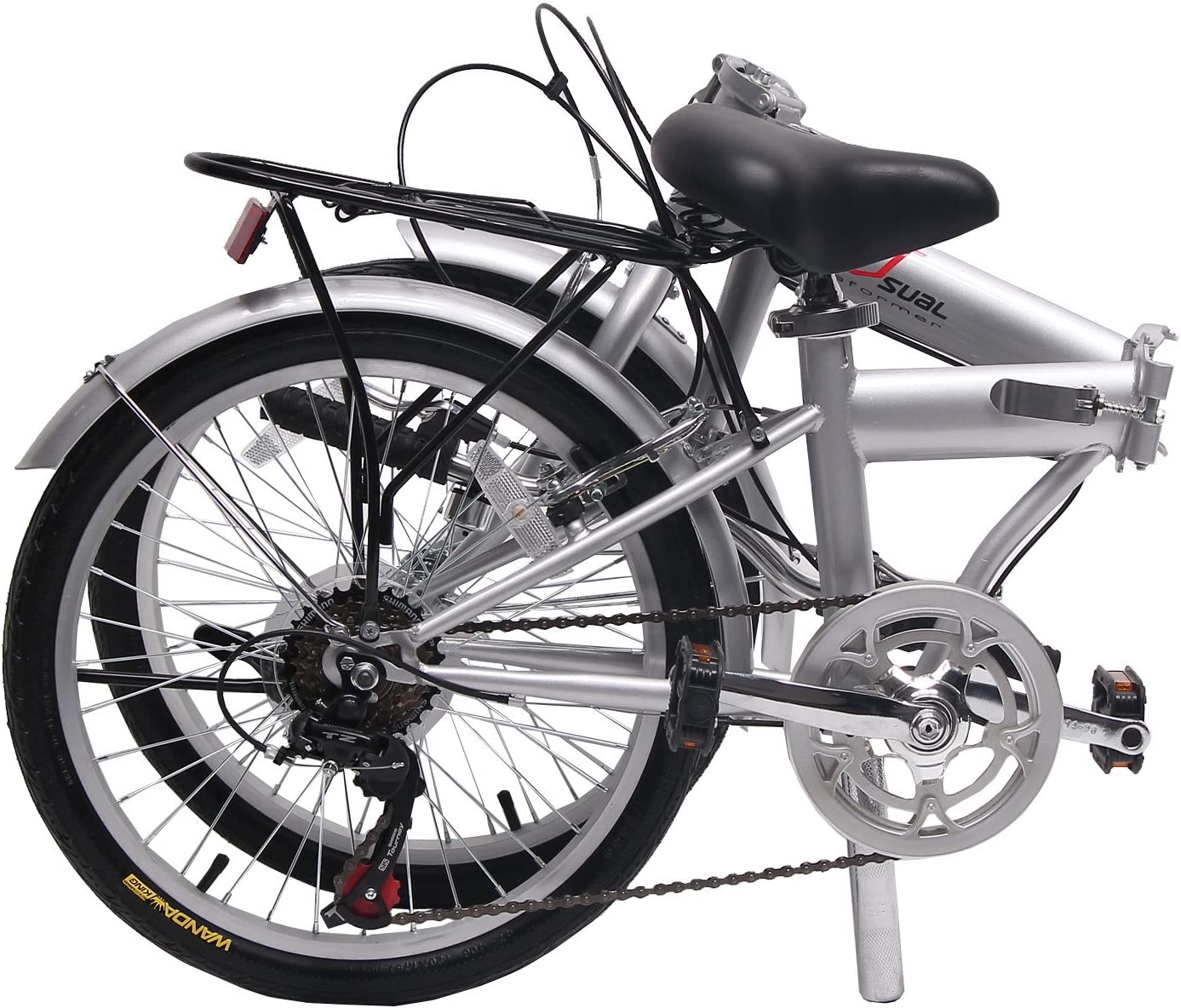 20 - inch folding bicycle designed for commuting and exercising. Shimano 6 speed shifter and derailleur. semi-alloy front and rear V-brake. WANDA 20" x 1.75 tires Quick removable front handle stem. with alloy silver color cap & PVC black bell. Easy assembly and ride