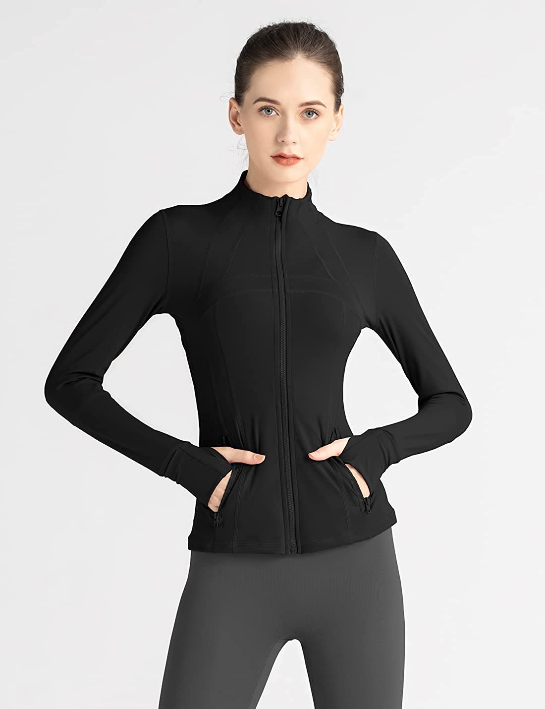 Slim fit sports jackets with thumb holes provide hand coverage and warmth.