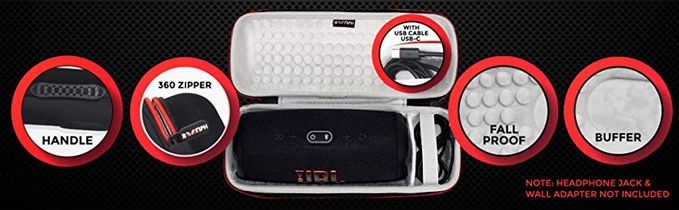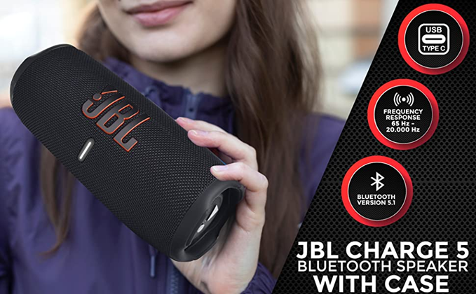 • PROTECTIVE HARDSHELL TRAVEL CASE INCLUDED: Along with your new JBL Charge 5 Speaker you will also receive a durable hardshell travel speaker case with a mesh pocket for your USB cables to keep everything tidy and well protected. Strong, durable and yet lightweight, it is great for shielding the Bluetooth speaker from everyday tear and wear even when you carry it with you in your backpack or travels.