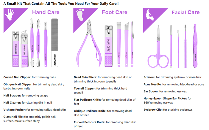 • MULTI FUNCTIONAL: Our manicure set covers your daily needs for hand care, foot care and facial care. You don't need to buy nail clippers, scissors, tweezers or files separately online or in the supermarket, just buy our pedicure set and get 16 pcs very practical beauty tools. Save you a lot of money!