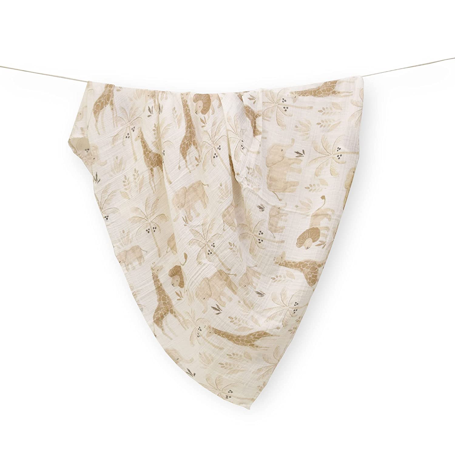 SIZE: One 47" x 47" pre-washed cotton muslin swaddle blanket in safari animal print