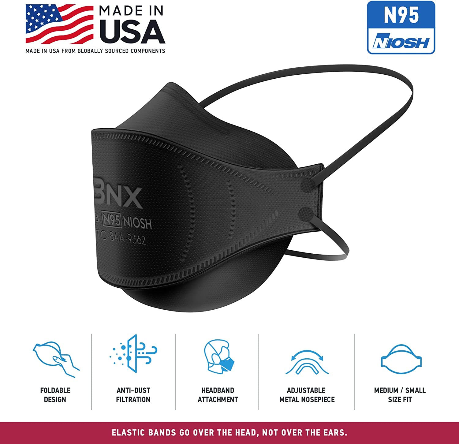BNX N95 Mask Black NIOSH Certified MADE IN USA Particulate Respirator Protective Face Mask, Tri-Fold Cup/Fish Style, (10-Pack, Approval Number TC-84A-9362 / Model F95B) (Headband) Black