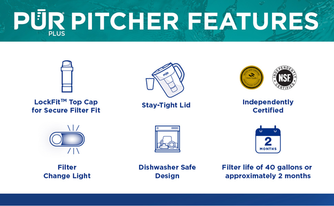 While home tap water may look clean, lead and other contaminants can get into your water through leaching lead service lines or from lead contained in household plumbing. The PUR PLUS 7 Cup Chemical and Physical Filtration Water Pitcher offers cleaner water quickly and easily, right in your fridge. This PUR PLUS water filter pitcher is WQA certified to reduce lead and other chemical and physical contaminants that could be lurking in your drinking water. PUR PLUS filter PPF951K™ is certified to reduce 3X more chemical contaminants than Brita's® leading pitcher filter.* A water filtration system is important because tap water may look clean, but can contain contaminants from pipes. Additionally, using a PUR PLUS with lead reduction filter system can reduce plastic waste and is more affordable than bottled water, helping you save up to $1,000 per year. Plus, each replacement water filter provides 40 gallons of filtered water, or 1-2 months of typical use. PUR is the #1 selling brand among certified lead reducing filters.** PUR has been developing innovative technologies for superior water filtration for over 30 years. We believe life deserves PUR water. * Versus best-selling Brita® pitcher filter OB03. Brita® is a trademark of Brita LP. **Based on Nielsen sales data for the 52 weeks ending 05/01/21.