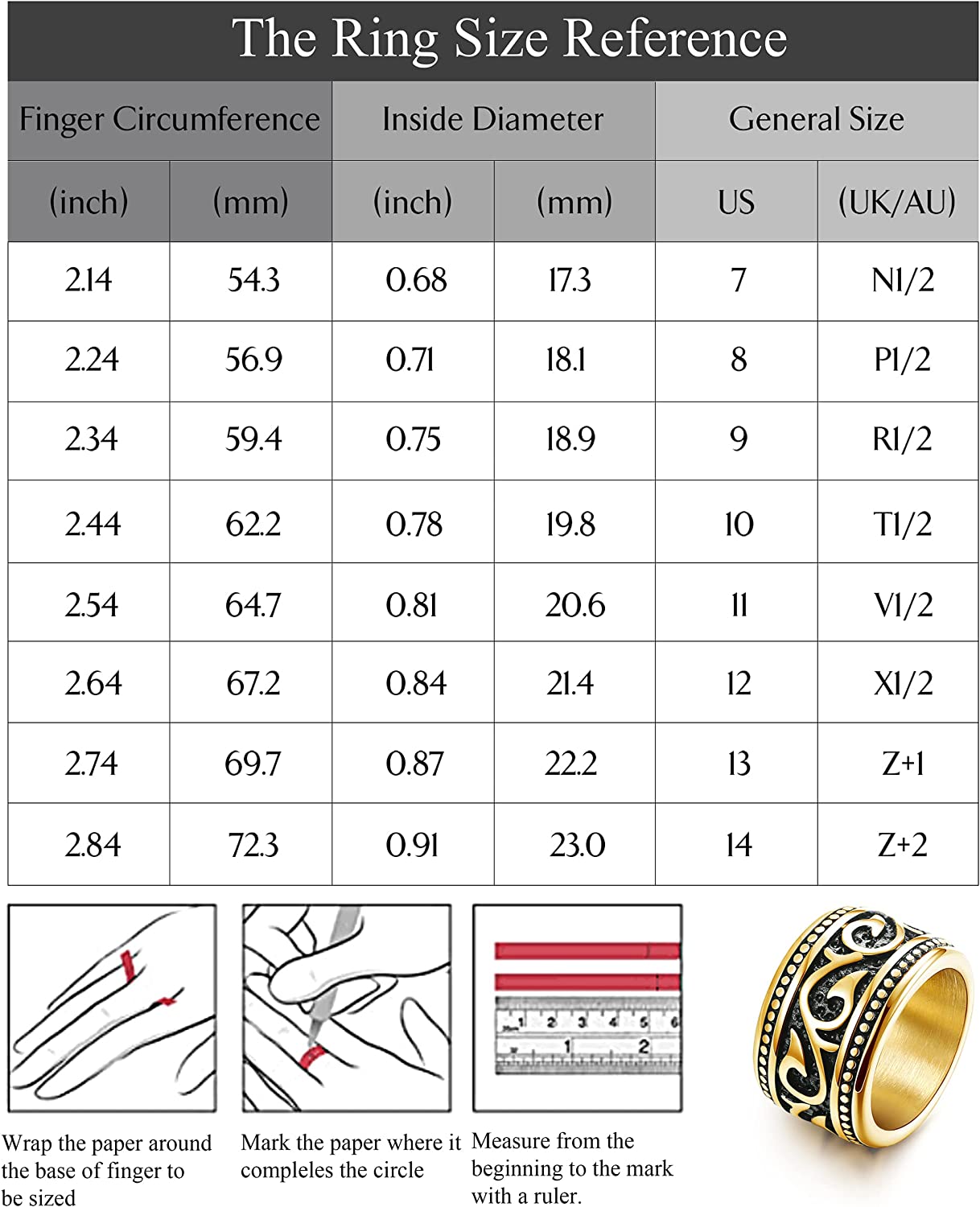 【Standard Ring Size】Width:Celtic Signet Ring is 0.57”, Thumb Wide Ring is 0.67”, Cuban Chain Spinner Ring is 0.3”,Greek Key Engraved Ring is 0.3''.Size 7-13 for Available,Suitable for Most Unisex Finger.Before Choose the Ring Size Please Measure Your Finger in Right Way to Save Your Time.You Can Refer to the Last Size Reference Chart to Choose the Ring Size.