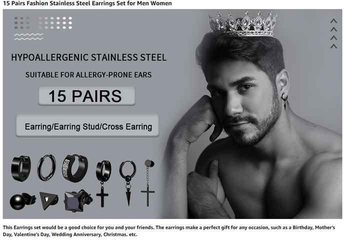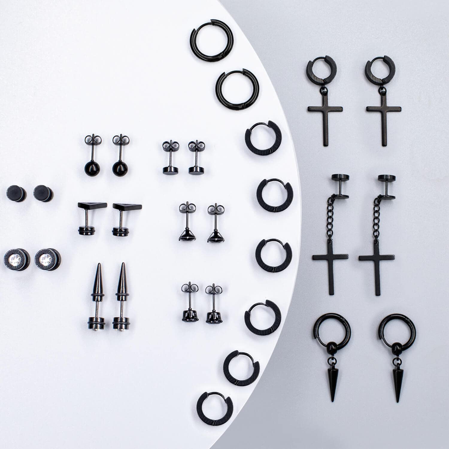 Earring Set Include - 15 pairs of men's earrings and ear studs come with a beautiful box, 4 pairs of circle earring hoops, 3 pairs of black dangle-hinged hoop earrings, and 8 pairs of different shapes of black ear studs. More wearing choice, suitable for men and women.