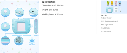 [Rechargeable & Light ] - The toddler toy comes with built-in rechargeable battery and can be used for up to 4.5 hours, no need to charge frequently. The card reader weights 71g and dimension is 4*3.5*0.5inches, easy for kids to hold. Volume is adjustable. A portable bag is provided for easy storage of the cards and card reader