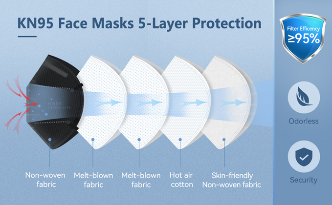 • 5-Ply Protection: This KN95 mask is made of 2 non-woven outer layers, 2 melt-blown inner filter, 1 non-woven cotton middle layer, offers more protection than a standard disposable 3-Ply mask. The filter efficiency is 95% which is tested by NPPTL, greatly keeping you from dust, PM 2.5, haze, smoke, automobile exhaust, etc.