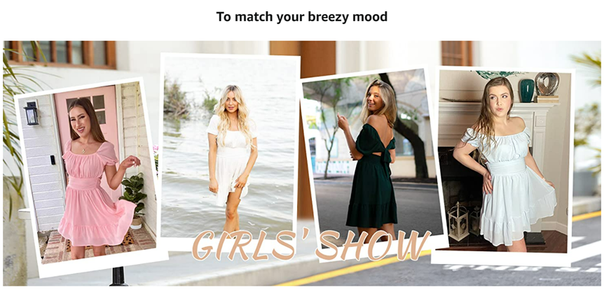 • Design: Square neck, off shoulder, ruched bust, puff short sleeve, smocked, elastic waist, high waist, A line silhouette, solid color, mini dress, frill hem, flowy swing dress, open back