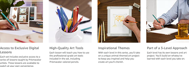 Learn art at your own pace from the comfort of home with Prismacolor Technique. Each Prismacolor Technique set features a unique coupon code for access to digital art lessons you can’t get anywhere else. Instructed by Prismacolor artists, each lesson will teach you how to use the professional-grade art supplies included in the set to create a piece of art you will cherish. The Level 3 Animal Drawing Set is designed for those who have built up some skill and confidence in art. You’ll learn how to take your skills to the next level by recreating any animal photo using reference grids. The set features Prismacolor colored pencils with rich cores for smooth color laydown and an artist roll case so you can store and carry your art tools. You’ll also receive an illustration marker, a clear reference grid overlay, a graphite pencil, a colorless blender, an eraser, a drawing pad, a mini sharpener, a drawing template with grid, a set of instructions, and hours of online content to learn at your convenience!
