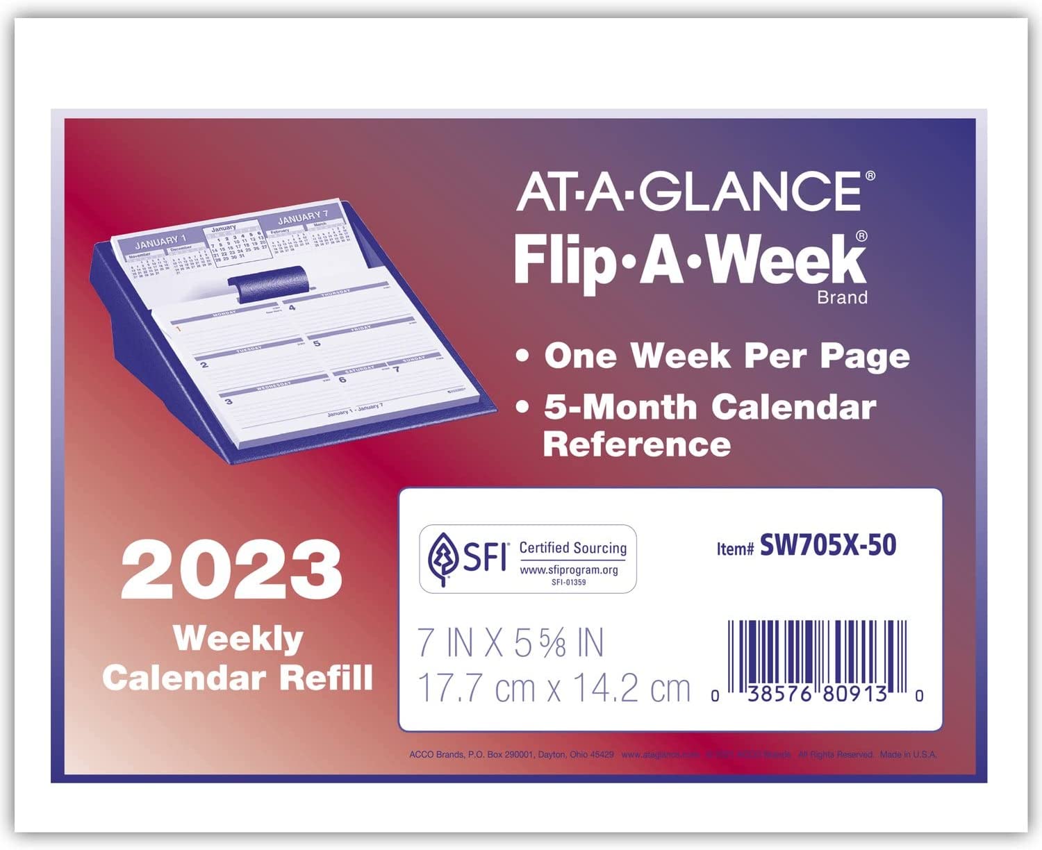 Keep track of important deadlines, special events and more with clear organization and unique style. The AT-A-GLANCE Flip-A-Week Desk Calendar Refill covers 12 months from January 2023-December 2023. Plan your schedule without fear of distracting ink bleeding. Our improved, high-quality paper is designed for superior ink bleed resistance, which keeps plans neat and legible. One week covers a single page. Features ruled daily space for planning and 5 reference calendar blocks. Pages measure 6" x 7". Reuse your favorite refillable base year after year. These refill pages are compatible with 1 ring Flip-A-Week calendar bases SW706, SW700X and SW706X.