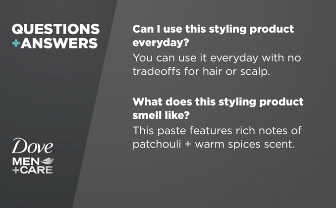 • DOVE SCULPTING HAIR PASTE: Dove Men+Care Sculpting Paste creates textured styles with a matte finish that can be reshaped and restyled throughout the day