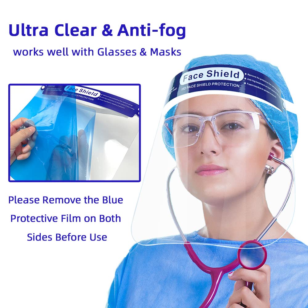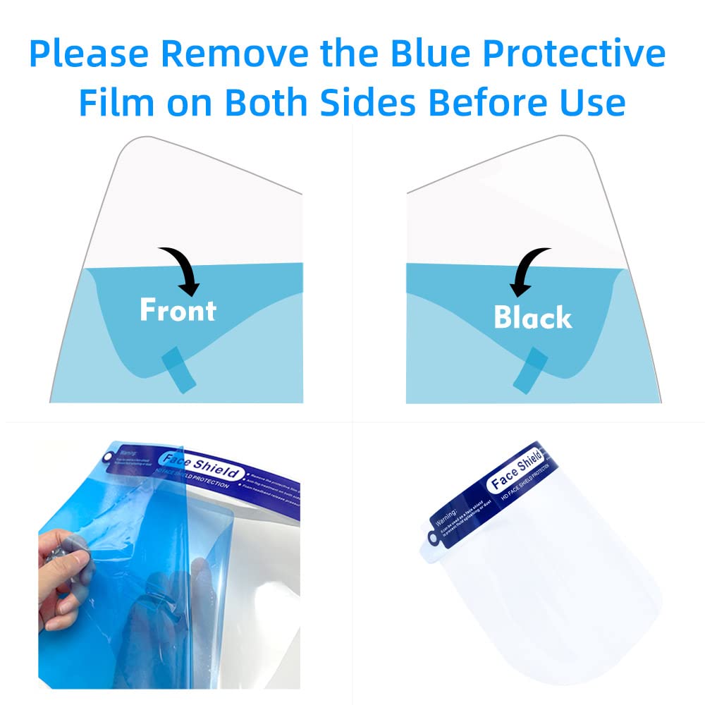 • Full Clear Face Shield:Safety face shield for work is coated with anti-fog material,not fog up your glasses when you breathe.double-sided anti-fog effect. The plastic face shield mask covered with the protective films both side, befor use kindly remove them you can see clearly.
