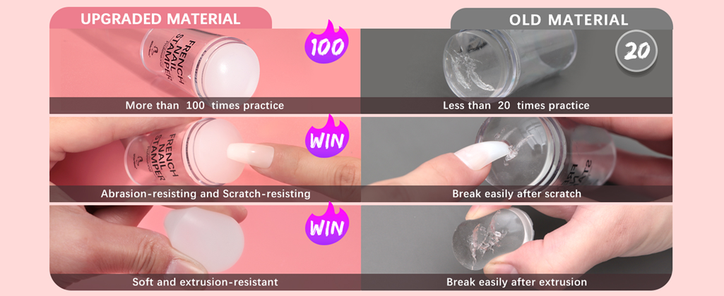 • Much Durable & Scratch Resistance & Softer: With the upgraded silicone material, our french nail stamper is more suitable for doing french nail art. There's no scratch and imprint after pressing the nail tips into the stamper. The softer gelly head can allow longer nail tips to press in.