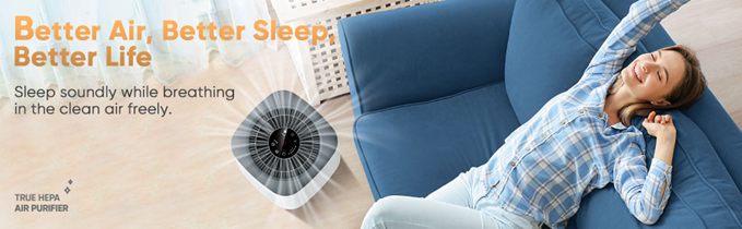 • Considerate Sleep Mode, Convenient Timer Function. The air purifiers for bedroom run at an ultra-low noise level of 24dB. Before sleep, turn on the sleep mode with low fan speed and backlit off, not disturbing your quietness. Timer setting varies from 2-4-8H to turn on/off the device. Set the boot time and feel the fresh air once getting home.