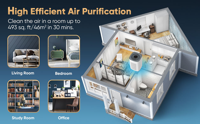 • High-Efficiency Air Filtration, Whole-House Purification. With a high clean air delivery rate (CADR) of up to 220m³/h, the air purifier refreshes the air 2 times per hour for a 493 sq.ft room and 6 timers per hour for a 183 sq.ft room. Ten minutes of use changes the air quality significantly, ideal for enclosed rooms like living rooms or bedrooms.