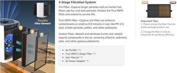 • 3-Level Fan Speed, 3-Stage Filtration System. Adjust the fan speed(low, medium, high) for different room sizes. A pre-filter traps larger particles, including human hair, fibers, pet fur, and dust particles. A true HEPA filter removes 99.97% of airborne particles sized 0.3 microns, like PM 2.5, dust, smoke particles, pollen, and other pollutants. A carbon filter absorbs/eliminates fumes and volatile organic compounds in the air.