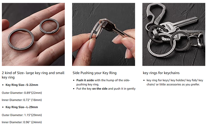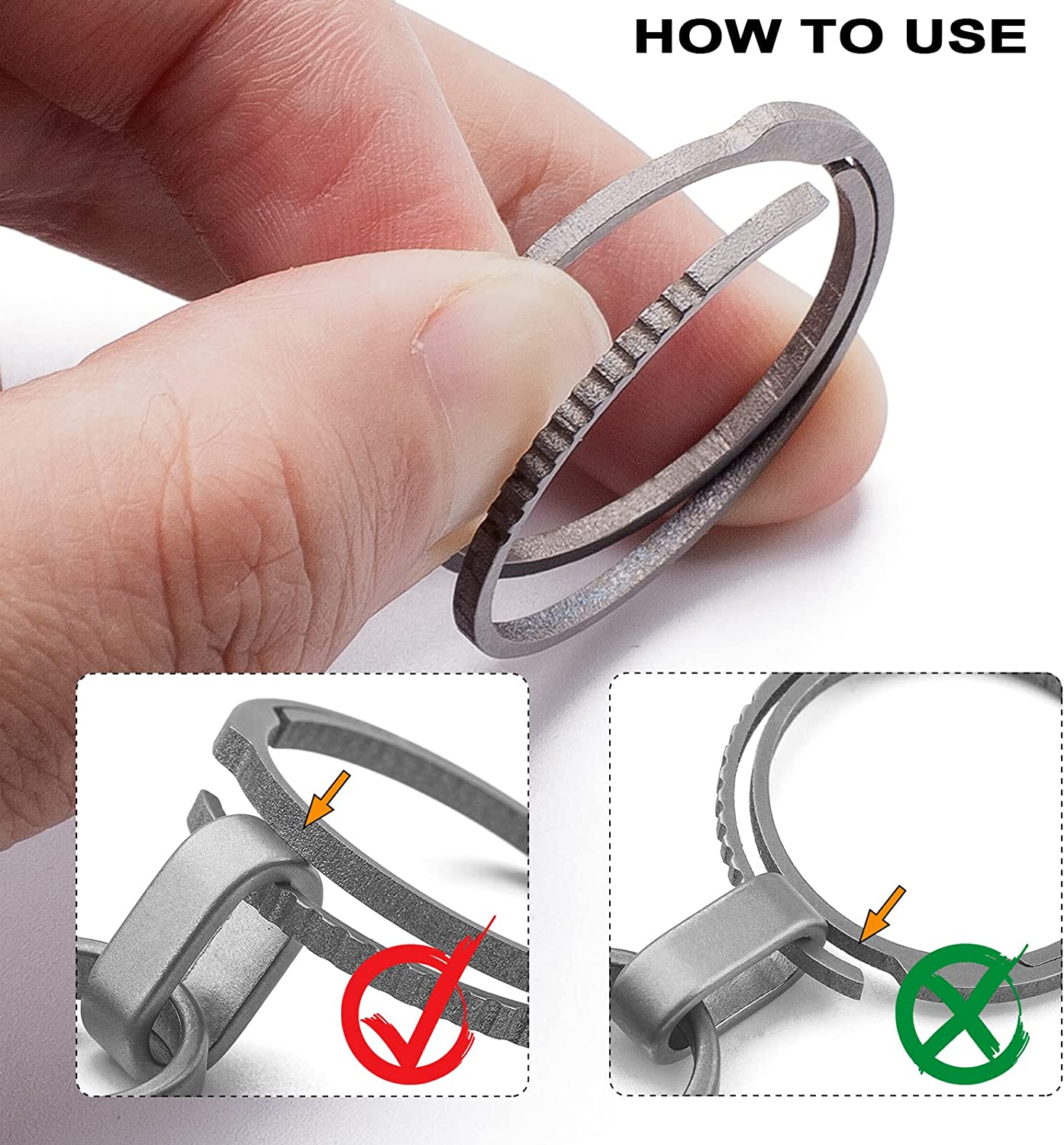 • NOTE:Please just pushing the titanium key ring to the side allows for super fast key ring manipulation. DO NOT pull it up from the top. 【LESS EFFORT AND TOOL FREE】 titanium key ring unique “pump” design makes you put the ring to the other side way more easier.Let’s forget the pain of separating our nails from fingers.