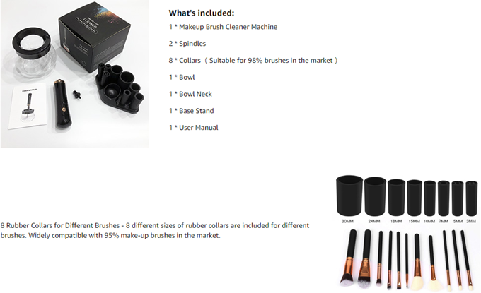 • 8 Rubber Collars Different Brushes - 8 different sizes of rubber collars are included for different brushes (Diameter: 3mm, 5mm, 7mm, 10mm, 15mm, 18mm, 24mm, 30mm). Widely compatible with 95% make-up brushes in the market