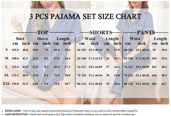 • 3PCS PAJAMA SET FOR WOMEN: Women's silk satin pajamas set comes with comfy short sleeve pajamas shirt, silky shorts, a pair of drawstring elastic waist pants. Classic short sleeve silk pajama set, you can match this sleepwear in differnt way to meet your needs all year around.