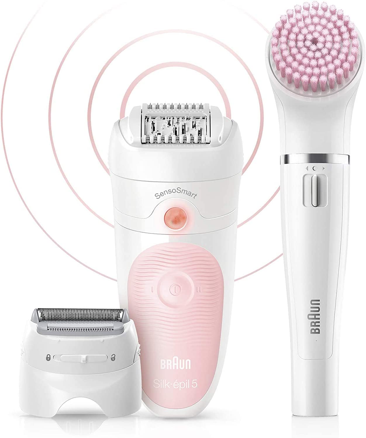 Meet the Beauty Set 5, the 6-in-1 hair removal and beauty set for face and body. Epilate, shave, trim, cleanse, exfoliate and apply creams and makeup. An exfoliating brush attachment removes dead skin cells to prevent ingrown hairs. The epilator removes 4x shorter hair than wax - for up to 4 weeks of smooth skin. The set includes a shaver and trimmer attachment for hair removal in sensitive areas. Three facial brush attachments for cleansing and exfoliating, and a makeup sponge for applying creams and makeup. Cordless use for up to 30 minutes. 100% Wet&Dry. Epilate while bathing or showering to reduce plucking sensation. With regular use, epilation is virtually painless.