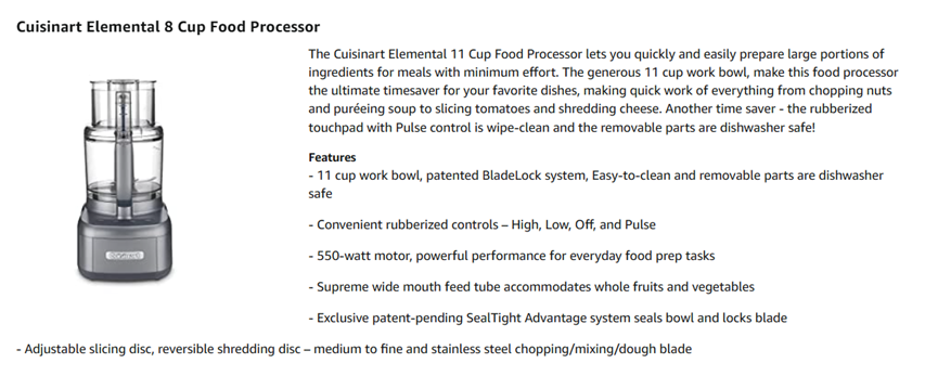 This Cuisinart food processor is designed to perform just about any food prep task a recipe calls for. It's big enough to chop ingredients for a party-sized portion of salsa, and powerful enough to turn a full work bowl of veggies into healthy pureed soups in seconds. Rubberized touch pad controls, and reversible shredding and slicing discs make this food processor a favorite of creative home cooks!; Cuisinart elemental 8 cup food processor, silver.