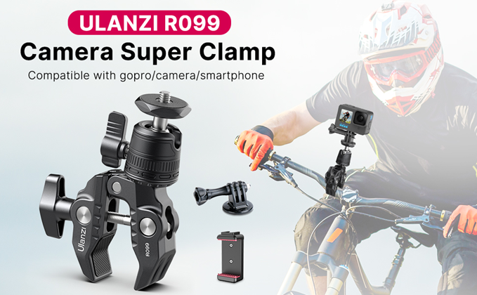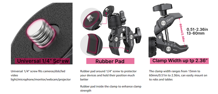 • Super Clamp: the open width of the super clamp ranges for 0.59in(15mm) to 2.3inch(60mm), which can help you fix the accessories on 2.3inch(60mm) rods/desktop. The super clamp enable you to add one more mounting position on desk/pole/tripod leg/camera cage/DJI Pole