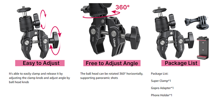 • Package: Super Clamp*1, Gopro Adapter*1, Phone Holder*1.