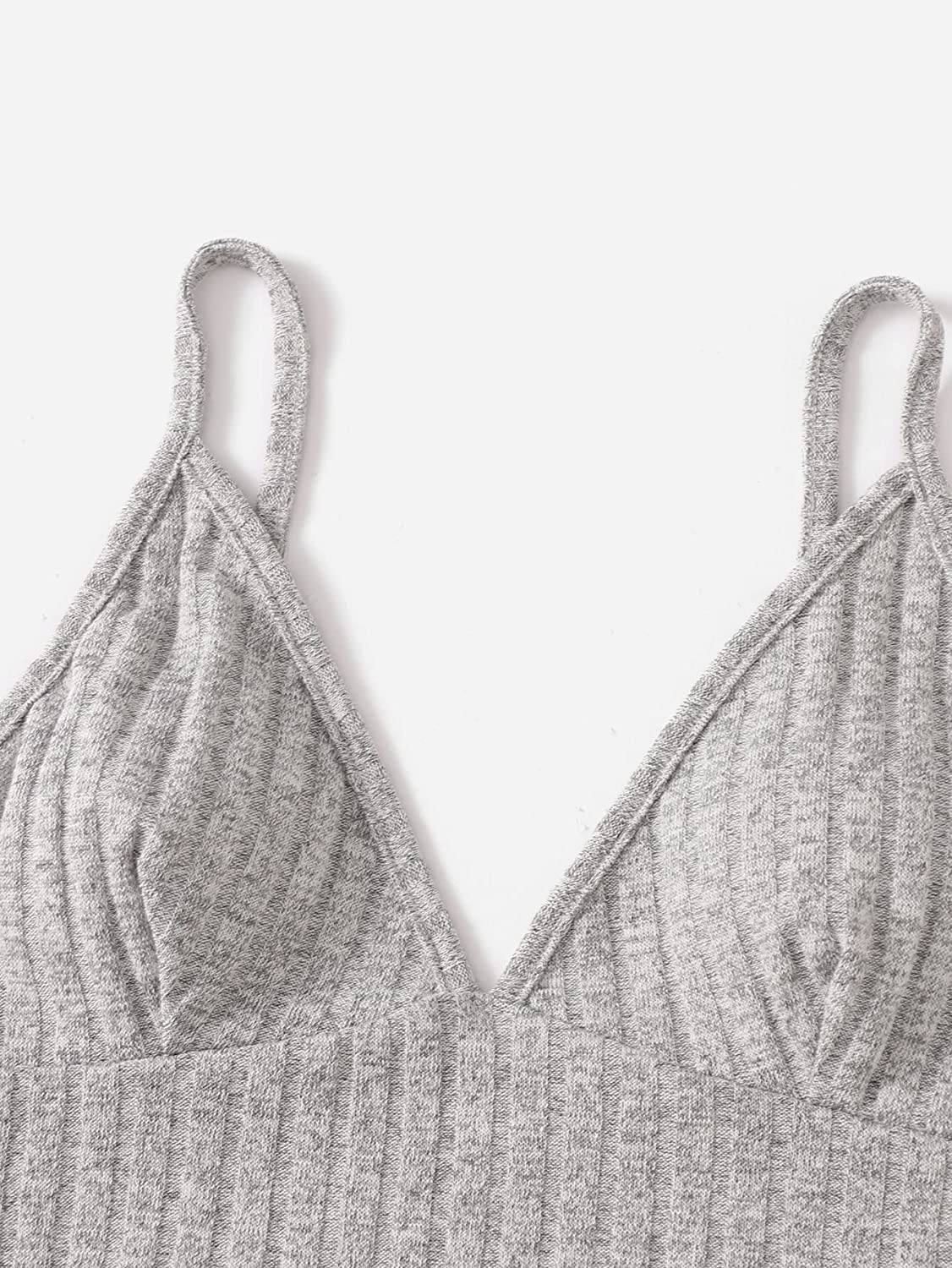 Features: Rib knit, spaghetti strap, sleeveless, elastic waist, lettuce trim, plain color, fashionable
