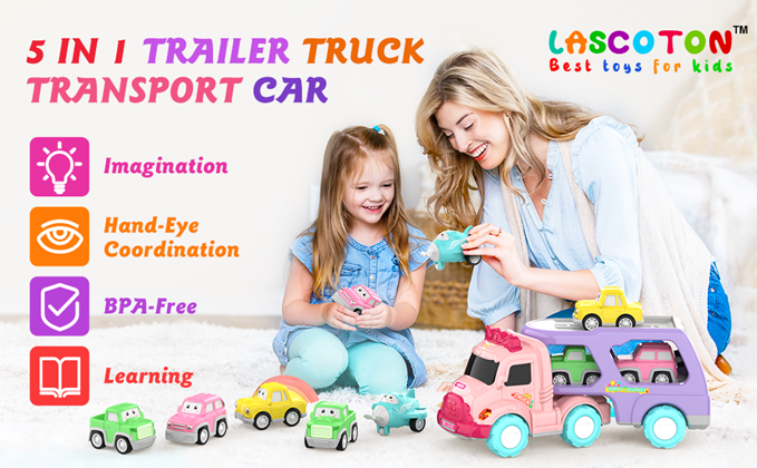 - ?【Toddler Toys Set】---LASCOTON 5-in-1 cartoon trailer truck cars set includes a large trailer and 3 different colorful cars & 1 airplane, which can helps children identify colors. The upgraded version of the rich color matching/cute cartoon expression/unique body printing brings more fun to the transport truck toy set.It's the best 1 2 3 year old girl gifts birthday or other festivals.