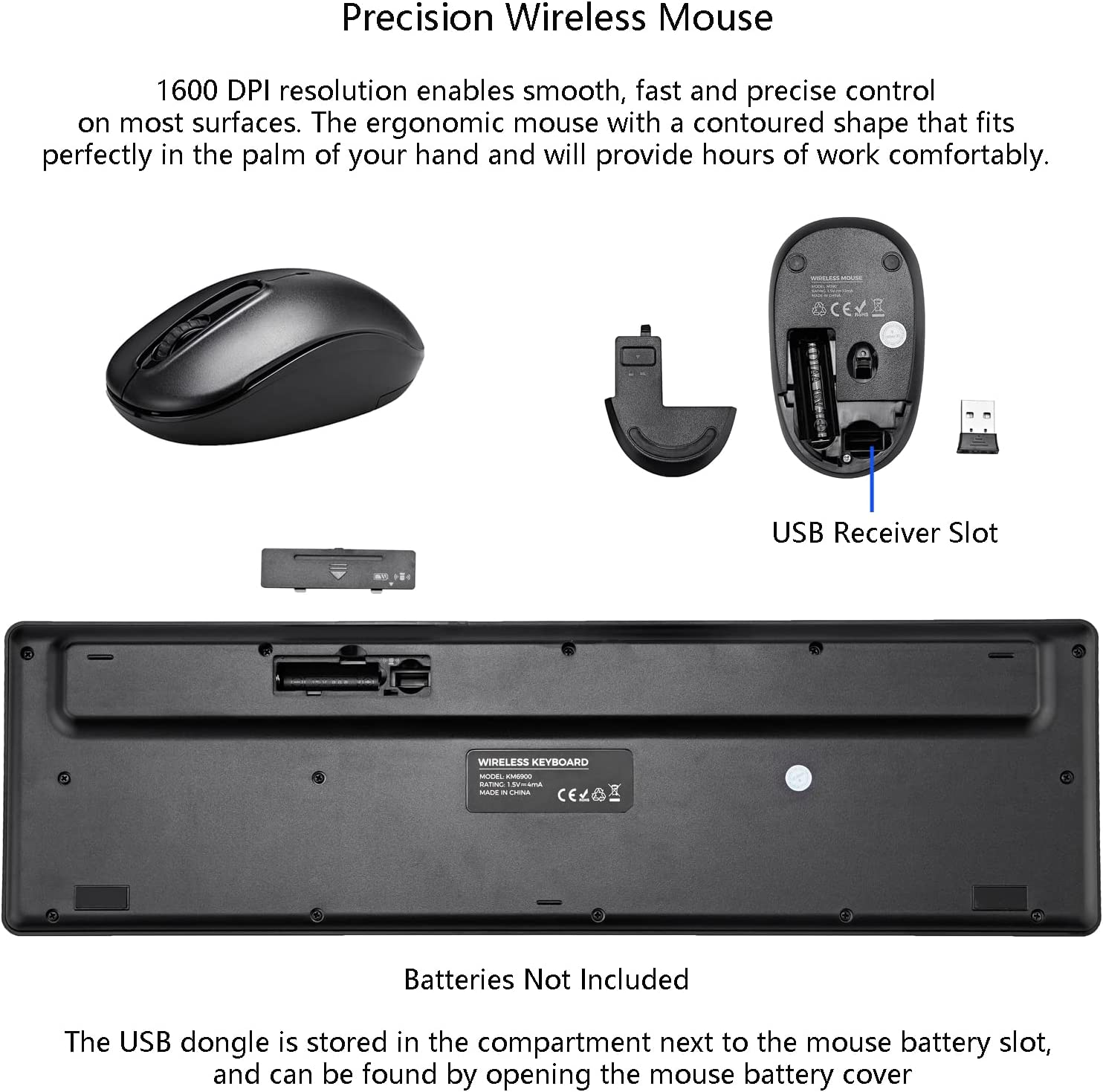 - Stable 2.4G Wireless Connection: Both wireless mouse and keyboard combo share the same tiny nano receiver, no need to occupy additional USB ports, plug and play without any drivers. Advanced 2.4GHz wireless technology provides a powerful and reliable connection up to 33 ft with virtually no delays or dropouts, even in the busiest wireless environments. Note: The USB dongle is stored in the compartment next to the mouse battery slot, and can be found by opening the mouse battery cover