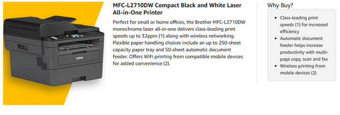 Based on competing in-class monochrome laser multifunction printers under $300. Print speed specifications gathered from manufacturer websites as of 1/9/2017. Requires connection to a wireless network.TN-760 High Yield vs. TN-730 Standard Yield. Up to two times more prints and lower printing costs based on yields and MSRP. Standard Yield and High-yield cartridges sold separately.Approx. toner cartridge yield in accordance with ISO/IEC 19752 (letter/A4).Reprinted from PCMag with permission. Copyright 2017 Ziff Davis, LLC. All Rights Reserved.Approx. 300 pages per month in accordance with ISO/IEC 19752 (Letter/A4) using the 2 toners provided in box.Requires additional purchaseThe mobile device must have NFC capability and run Android OS 4.4 or later.