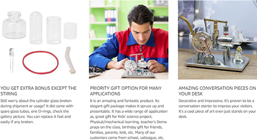 2. Suitable for more than 8 years of age, 8 years of age need to operate under the guardianship of parents. Stirling engine is traditionally classified as an external combustion engine. Please refer to wikipedia for more information.