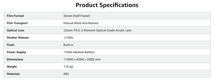 • ?​ Lightweight and Easy-to-use: The pocket-size camera is light and tiny, and hence convenient for you to bring along daily. Since its instructions are simple, it is suitable for all analog hobbyists.