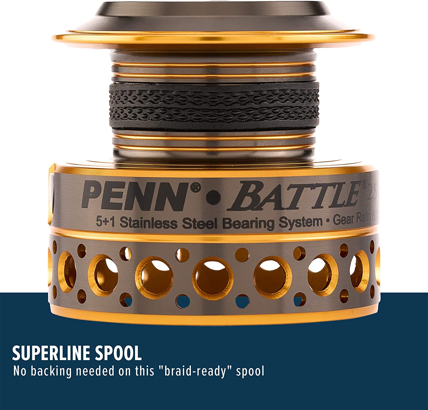 Arm yourself for the most punishing saltwater battles with the Penn Battle II Spinning Fishing Reel. Crafted from durable materials and packed with fish fighting features, this saltwater reel is engineered to catch fish year after year. From the full metal body, sideplate, and rotor to the five sealed stainless steel ball bearings, each component is designed to help you land your catch. The reel's HT 100 Versa Drag carbon fiber drag system leverages both sides of each drag washer to provide maximum drag, and its instant anti reverse bearing eliminates pullback so you reel without interruption. Additionally, the drag washers are treated with a proprietary grease to ensure long lasting performance. Suitable for use with Berkley or Spiderwire Superline, the spool is fitted with a rubber gasket that prevents the Superline from slipping under pressure meaning anglers can use braided line without a monofilament backing. And thanks to its line capacity rings, the spool displays at a glance how much line is remaining.