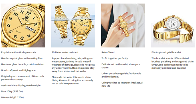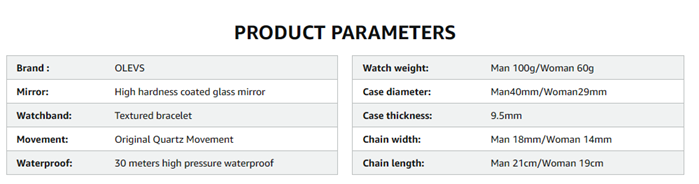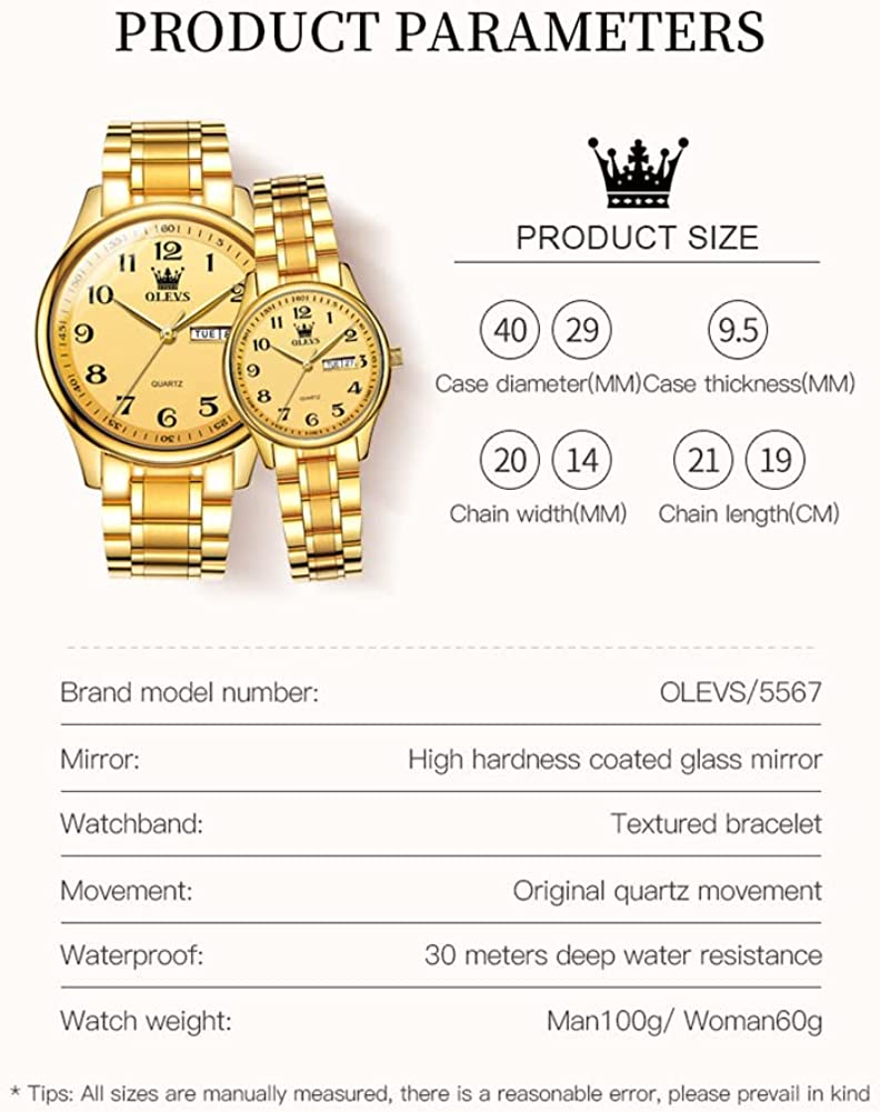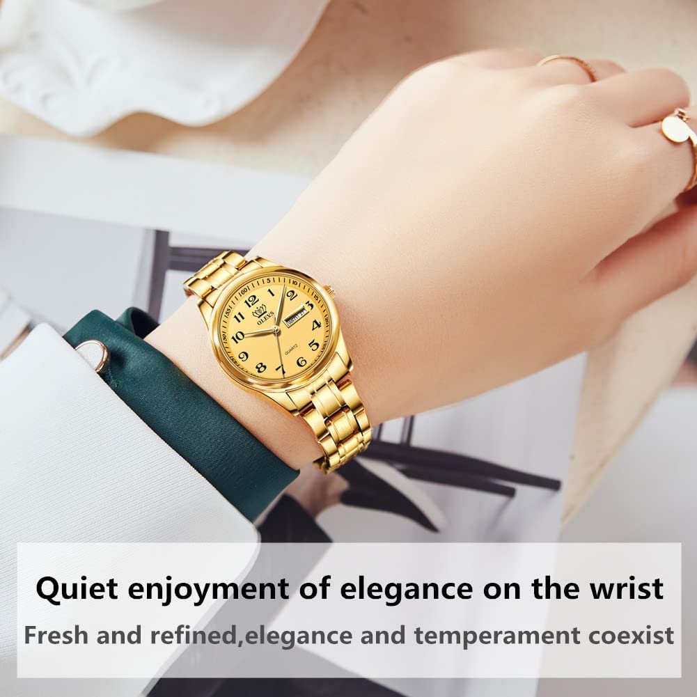 • 【Watch Type】 Fashion gold watches for women/analog quartz ladies watch,watch case:29mm diameter and 9.5mm thickness,precision quartz core,week and date display;±20 seconds per month accuracy,scratch resistant.We hope it acts as a daily reminder to never stop,never settle,and stay in relentless pursuit of your goals.At OLEVS,luxury is a value.It’s an attention to detail.It's a promise to never take shortcuts and a commitment to always providing our customers with the best.