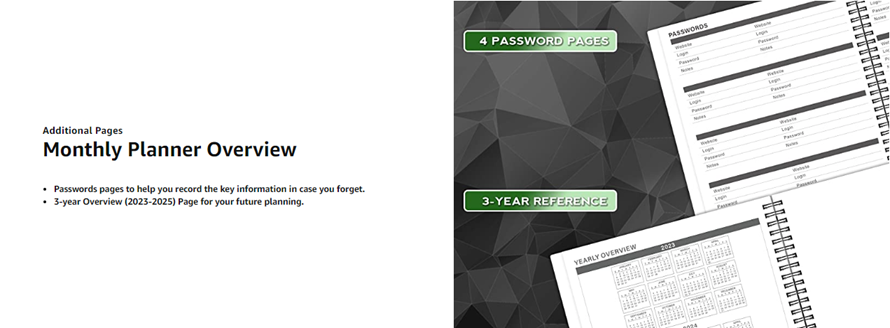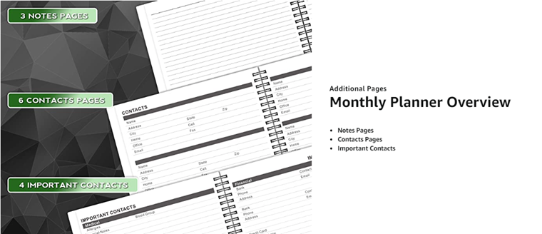 • ? Specialties of Monthly Planner - 9" x 11" Monthly Calendar Planner Pages | Important Contacts Pages | Two-year Monthly Calendar Pages | Contacts Pages | Passwords | Notes pages | Yearly Overview | Holidays | Thicker Paper | Cardboard Cover | Reference Information