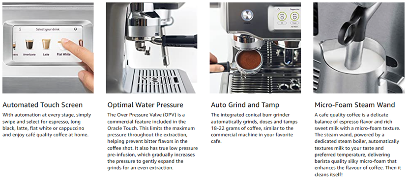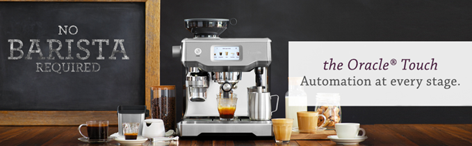 - The Breville Oracle Touch Espresso Machine with automation at every stage with touch screen operation to simply swipe and select for espresso, long black, latte, flat white or cappuccino and enjoy third wave specialty coffee at home.