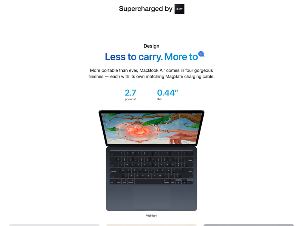 • STRIKINGLY THIN DESIGN — The redesigned MacBook Air is more portable than ever and weighs just 2.7 pounds. It’s the incredibly capable laptop that lets you work, play or create just about anything — anywhere.