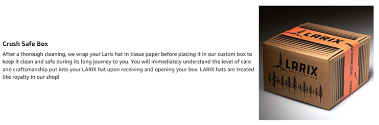 • SHIPPED IN BOX : After your hat has been cleaned and prepped we wrap your Larix hat in tissue paper before placing it in our custom box to keep it clean and safe during its long journey to you. IF YOUR HAT DOESN'T ARRIVE IN A BOX PLEASE REACH OUT TO US DIRECTLY TO LET US KNOW. You will immediately understand the level of care and craftsmanship put into your Larix hat upon receiving and opening your box.