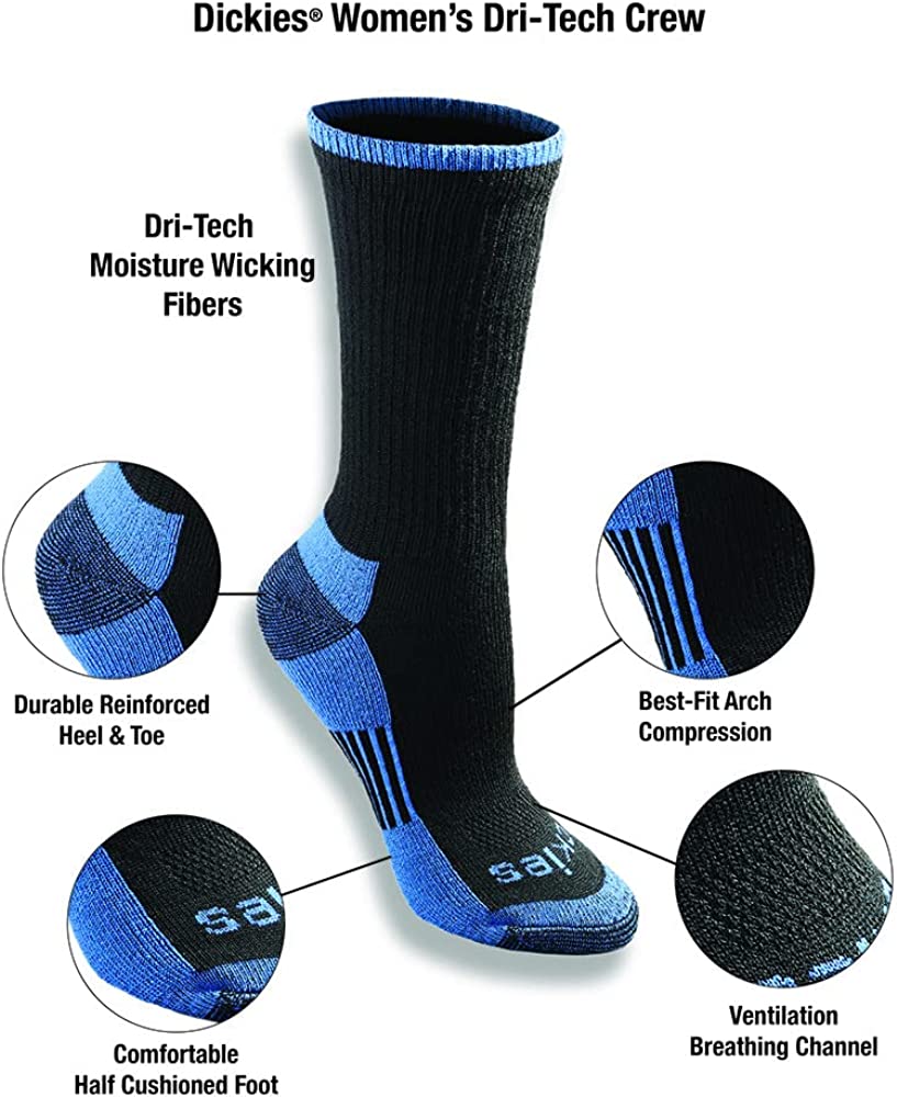 Dickies dri-tech moisture control for women crew sock combines moisture wicking fibers and mesh ventilation channels to keep feet dry and comfortable.