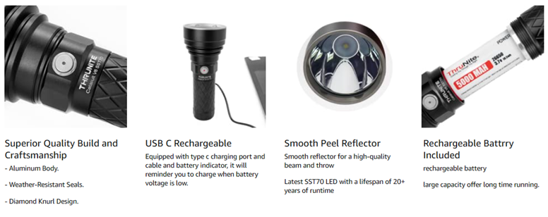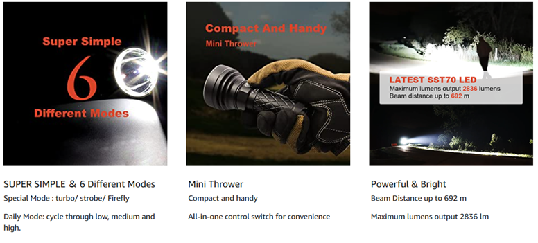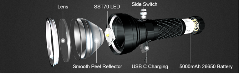 • Please CHARGE the flashlight before use, and pls SCREW DOWN the light head and tail cap first before charging.Please note that the new Catapult V6 SST70 has a slight difference in max output & beam distance than the old one because of the new update of the latest LED.