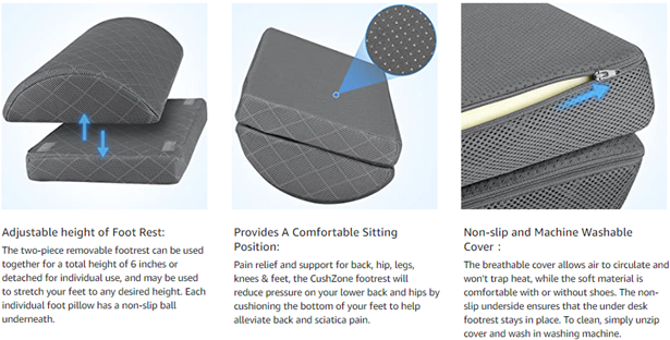 - Provides A Comfortable Sitting Position: Pain relief and support for back, hip, legs, knees & feet, the CushZone footrest will reduce pressure on your lower back and hips by cushioning the bottom of your feet to help alleviate back and sciatica pain. Our footstool will also ensure proper foot placement while sitting and correct sitting posture to help improve blood circulation in the legs and relieve pain over time.