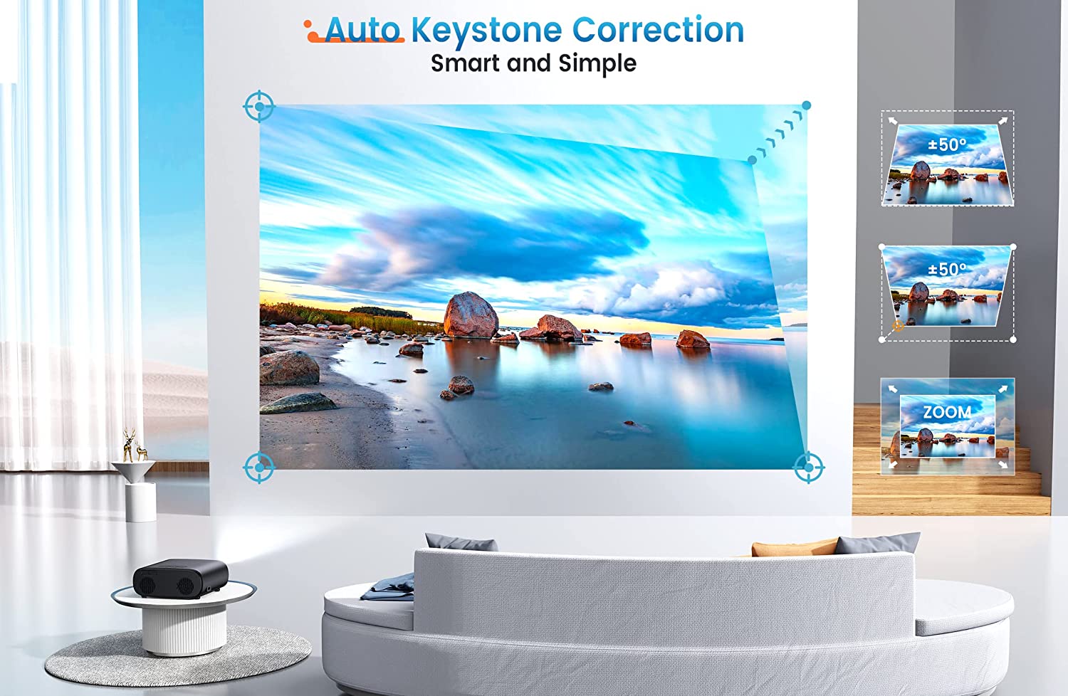▆【Auto 6D Keystone + 4P Correction, Zoom Function】AI keystone correction with built-in sensor & 6-way gyroscope, when the projector moves, it will automatically recognize and adjust the screen to a rectangle! You can place the projector anywhere you want. 100%-50% zoom adapts well to different screen sizes without sacrificing image quality. No worry about space limits. This portable movie projector always provides you with crisp pictures. Share the 300" giant screen with your family and friends!