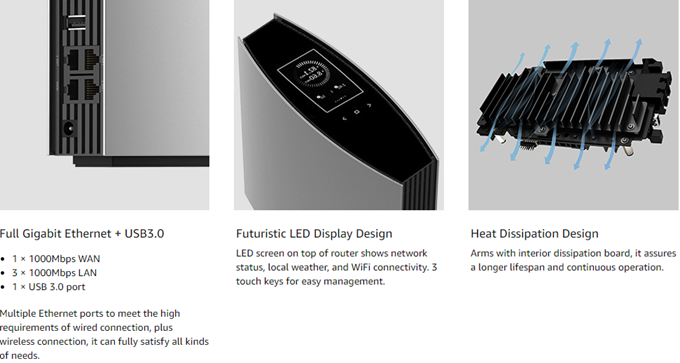 • 【4 Gigabit Ethernet, 1 USB & LED Screen】 – Provides 1x1000Mbps WAN and 3x1000Mbps LAN ports for better wired performance. USB3.0 port to share files & media with networked devices. Special LED screen on top of router shows WiFi connectivity and router status. 3 touch keys allow easy and accurate operation. Also supports app management.