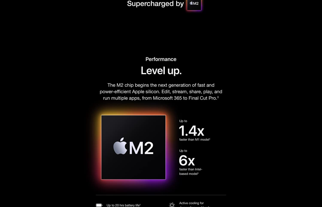 • UP TO 20 HOURS OF BATTERY LIFE — Go all day and into the night, thanks to the power-efficient performance of the Apple M2 chip.