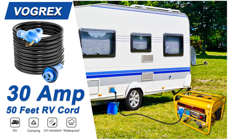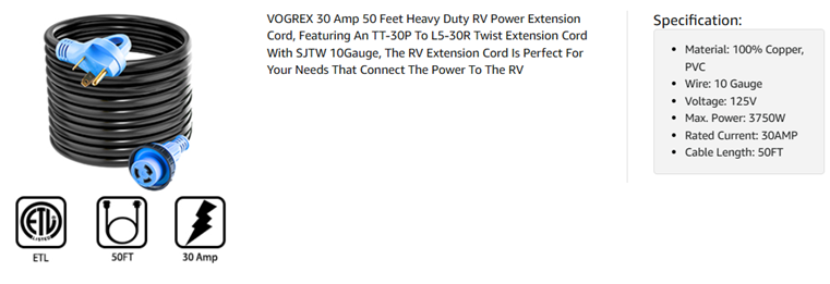 • ⚡【ELECTRICAL RATING】30A, 125V, 50 feet, STW power cord with TT-30P male plug and L5-30R female receptacle. ETL/cETL approved