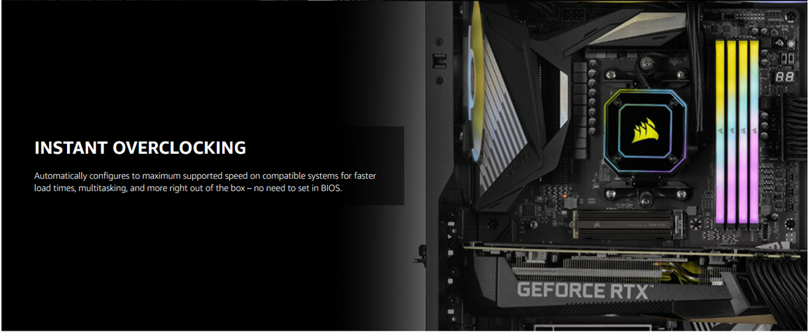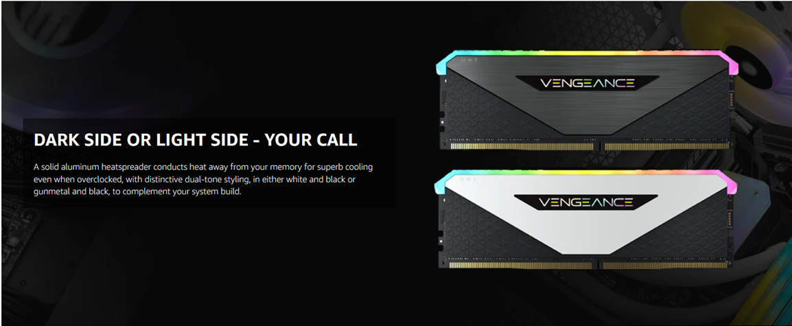 CORSAIR VENGEANCE RGB RT DDR4 memory punches up your PC’s aesthetics while delivering outstanding performance optimized for AMD systems. Every module boasts ten individually addressable RGB LEDs for brilliant illumination and a dual-tone heatspreader for sharp looks and superb cooling. VENGEANCE RGB RT can automatically configure to maximum system speeds for faster load times and smoother multitasking. Take control with CORSAIR iCUE software and customize RGB lighting to match your setup, create custom lighting profiles, and synchronize with all iCUE-compatible devices across the entire iCUE ecosystem. A custom PCB provides high signal quality for superb performance and stability, while tightly screened memory chips unlock superior overclocking ability. For mesmerizing, customizable RGB lighting and remarkable DDR4 performance, equip your PC with VENGEANCE RGB RT.