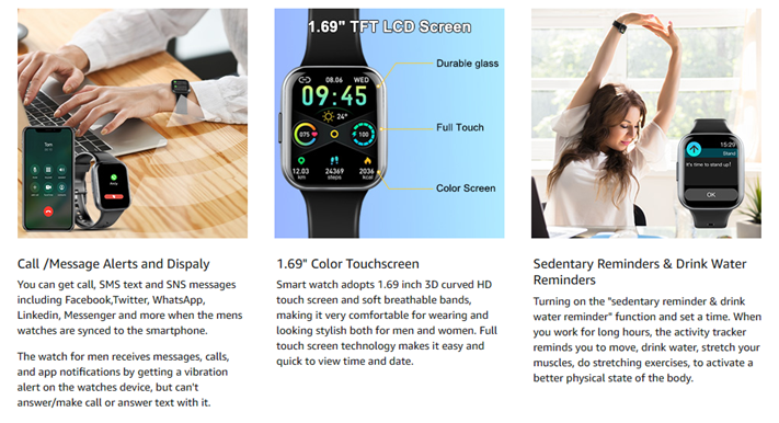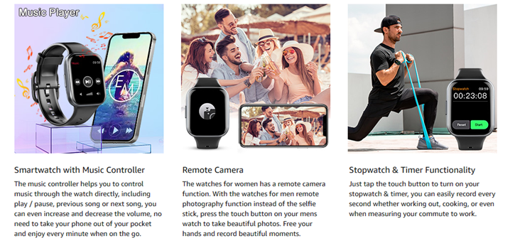 - New Multifunction Smart Watch: Smartwatch includes more practical functions, Fitness Tracker (Pedometer/Calories/Distance), Heart Rate Monitor, Sleep Monitor, 25 Sports Modes, IP68 Waterproof, Blood Oxygen Monitor, Call Notifications, SMS and APP Messages (WhatsAPP, Facebook...), Music & Camera Control, 6 levels of Brightness Adjustment, Weather Display, Sedentary & Drink Water Reminder, GPS tracking, Gmail, Stopwatch, Timer, Calculator, Alarm Clock, Do Not Disturb/Power-saving Mode, Find watch.